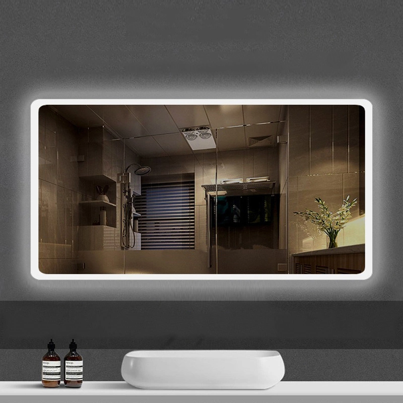Hogar / Producto / espejo de baño / Espejo LED de baño redondo rectangular iluminado sin marco montado en la pared de fábrica