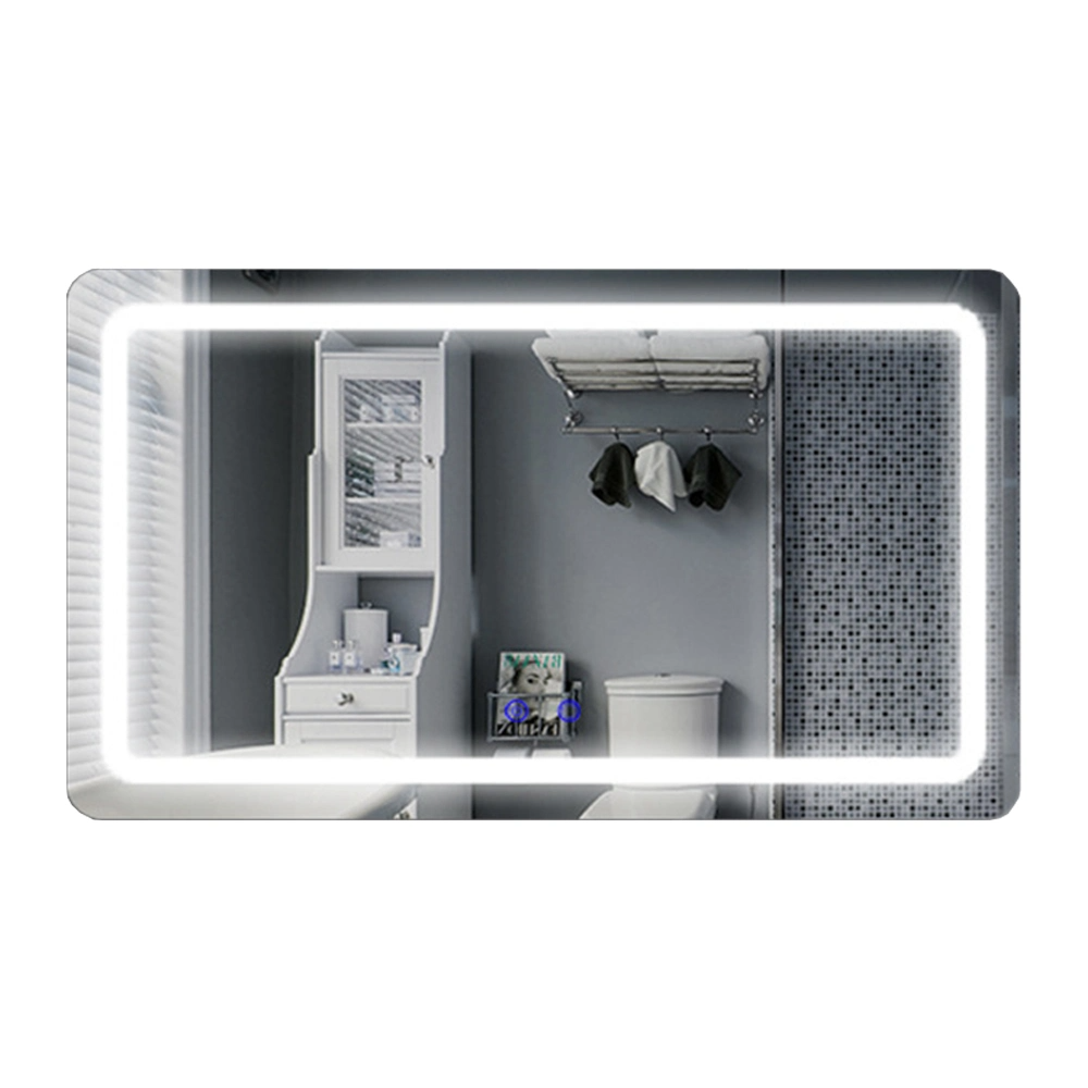 Hogar / Producto / espejo de baño / Espejo de lavabo inteligente decorativo para el hogar de lujo, espejo de tocador de vidrio de pared retroiluminado sin marco para baño LED